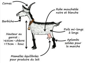 Gabarit : de grands animaux capables d’explorer tout type de terrain et d’ingérer des quantités conséquentes de fourrages. Les chèvres mesurent au moins 68 cm au garrot à l’âge adulte (18 mois), les boucs 5 cm de plus. Le poids des chèvres adultes doit atteindre 50 à 60 kg, et se situe pour les boucs de 70 à + de 100 kg