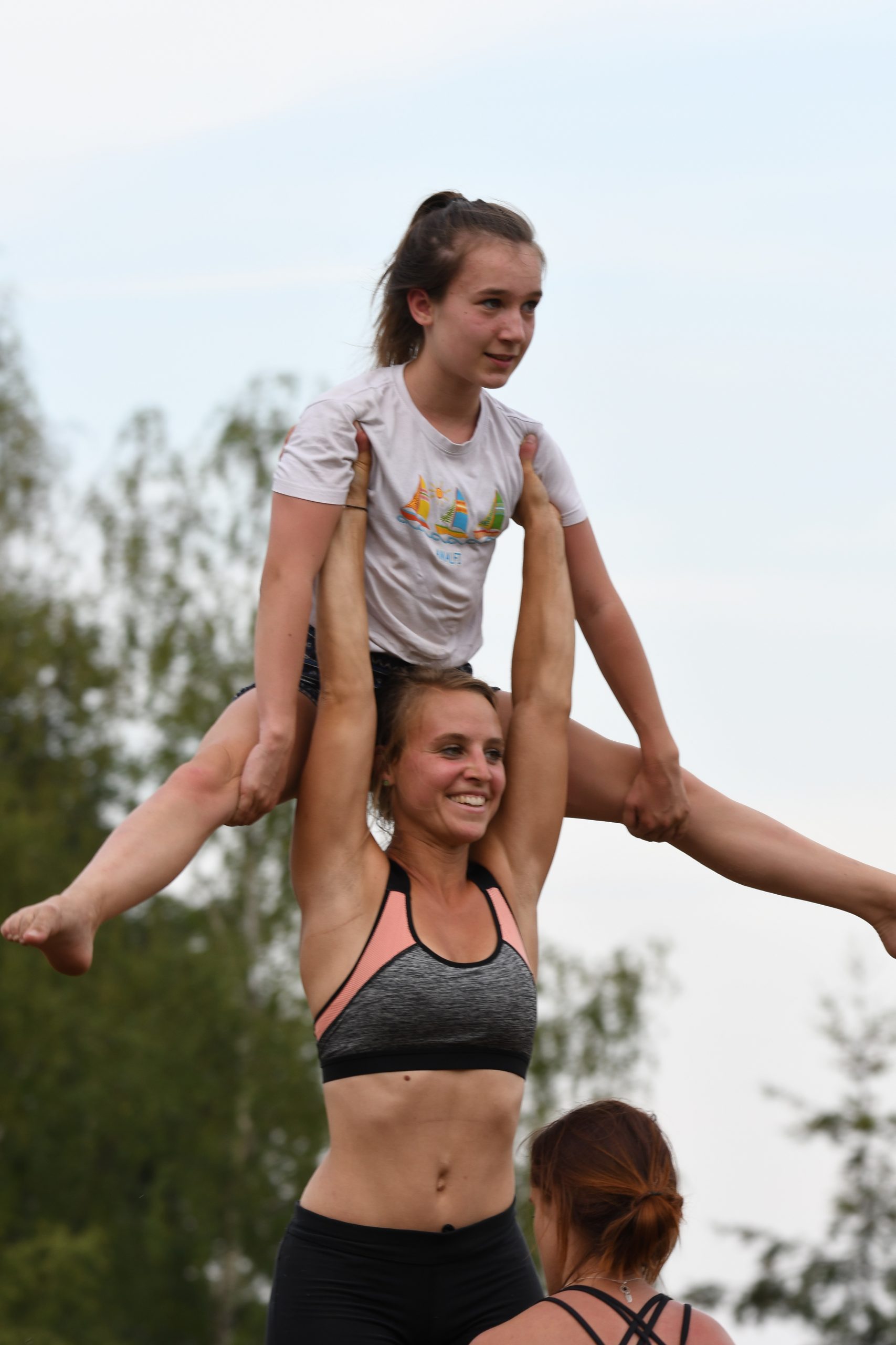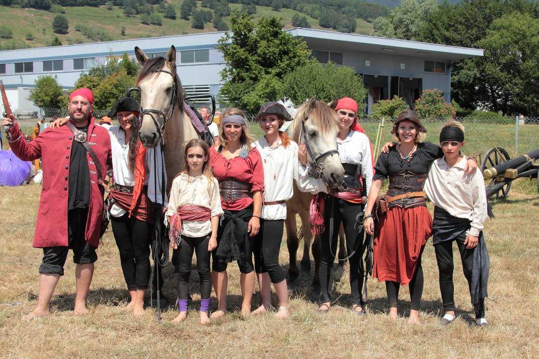 Au fil des années des voltigeurs se sont ajoutés à l’équipe, Rémi qui voltige maintenant beaucoup plus sportivement a laissé sa place à Flore qui se retrouve au sommet de nos portés. Les chevaux font aussi partie intégrante de l’équipe. Guignol nous a portées pendant des années et a pris une retraite bien méritée. Cyah est désormais notre jument de voltige et progresse énormément.