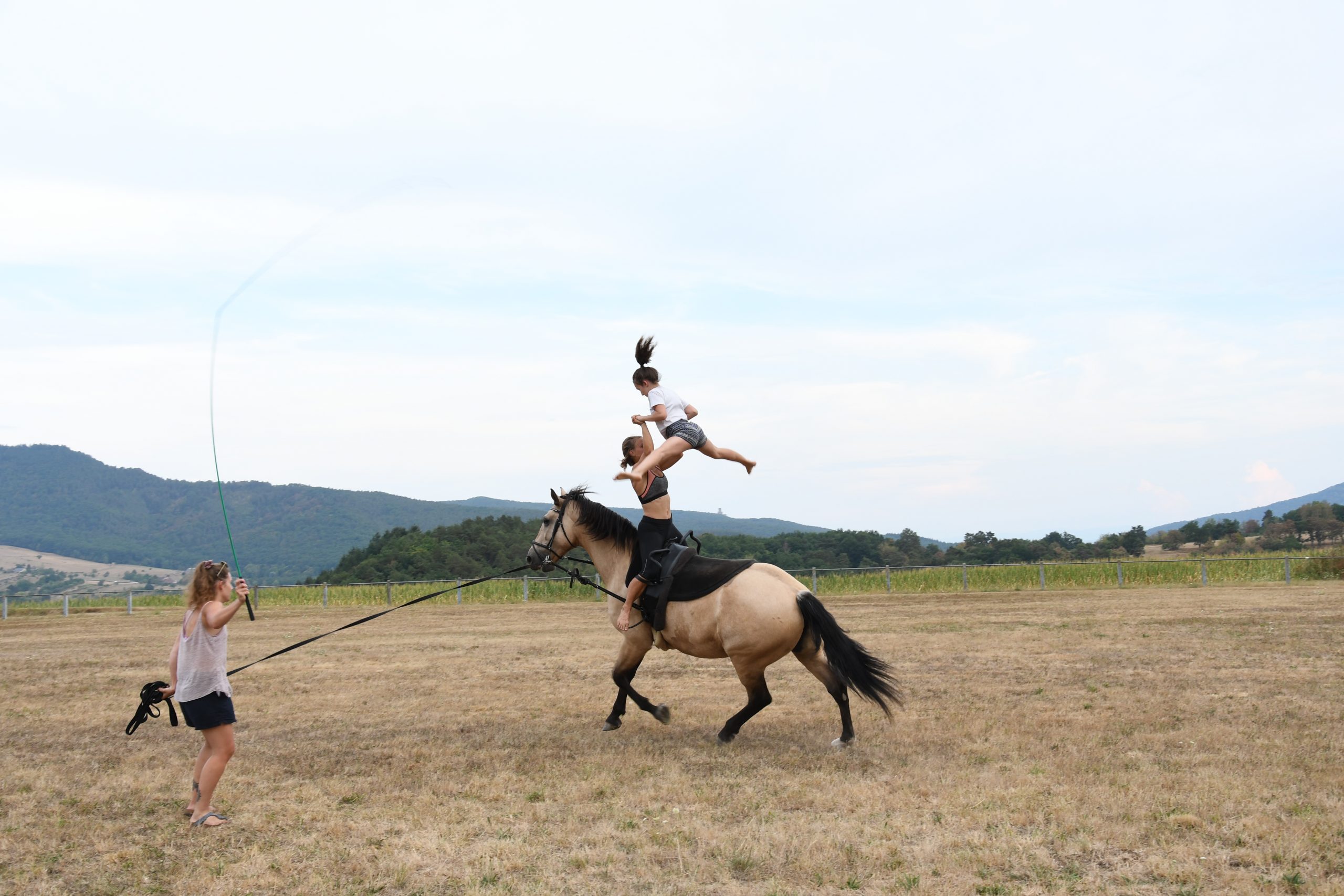 Le cheval dans tout ça, c’est juste le plus important. La passion qui nous lie. Nous voltigeons sur Guignol et Cyah, qui sont mes chevauxet nous préparons Dahlia la jument de Lucile pour les saisons prochaines. Nos chevaux sont la prunelle de nos yeux. Sans eux, pas même l’once d’un début de rêve. Le travail de voltige pure n’est pas quotidien pour eux, nous faisons quelques cessions de temps en temps il n’est donc pas épuisant. Mais le cheval doit avoir un bon équilibre, un caractère irréprochable, des réactions saines et aucune peur de l’environnement. C’est un travail immense à faire en amont, que Lucile et moi faisons au quotidien pour que nous puissions voltiger sereinement.