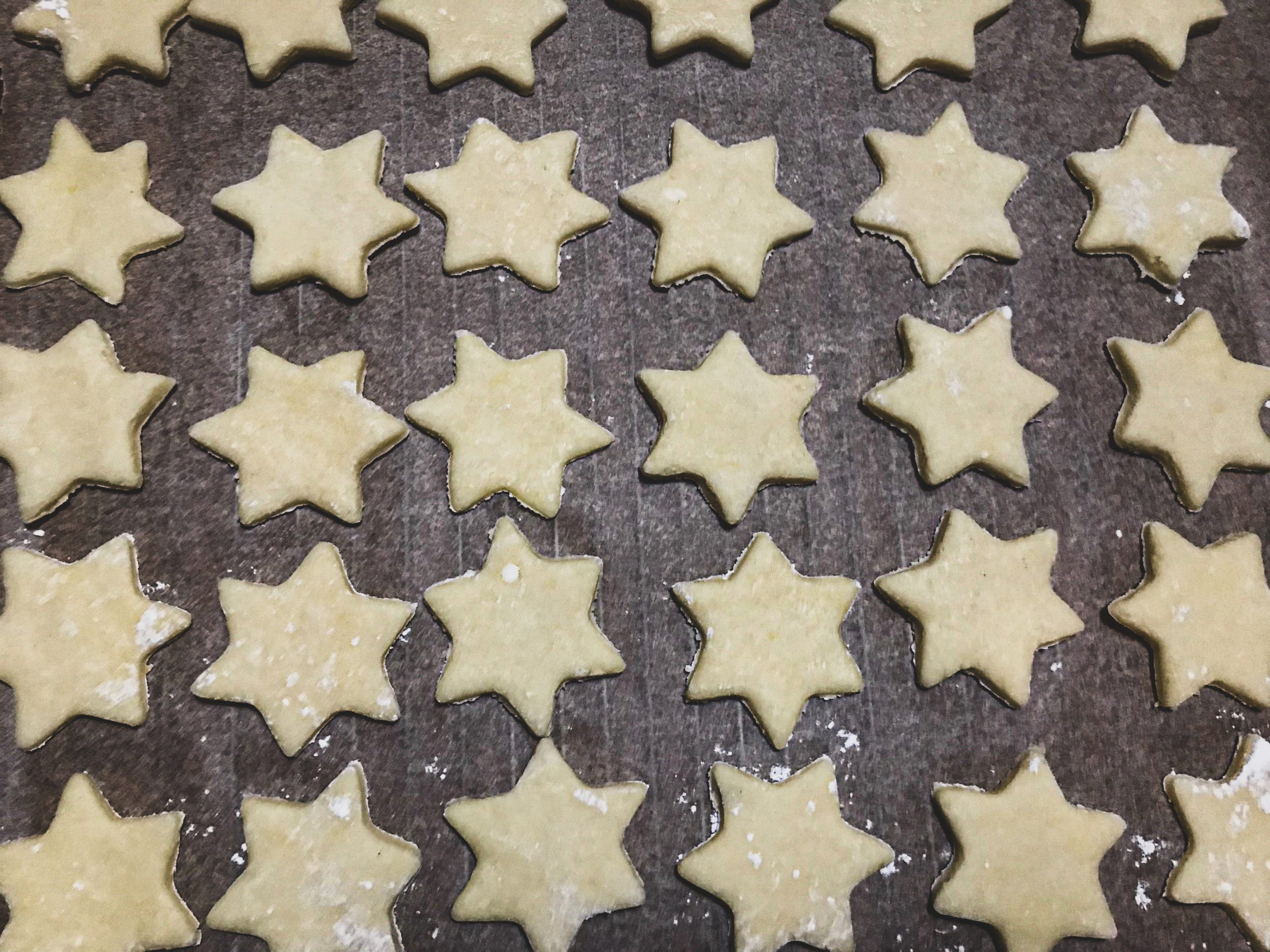 - Détailler des étoiles à l’emporte-pièce et les déposer sur une plaque recouverte de papier cuisson.