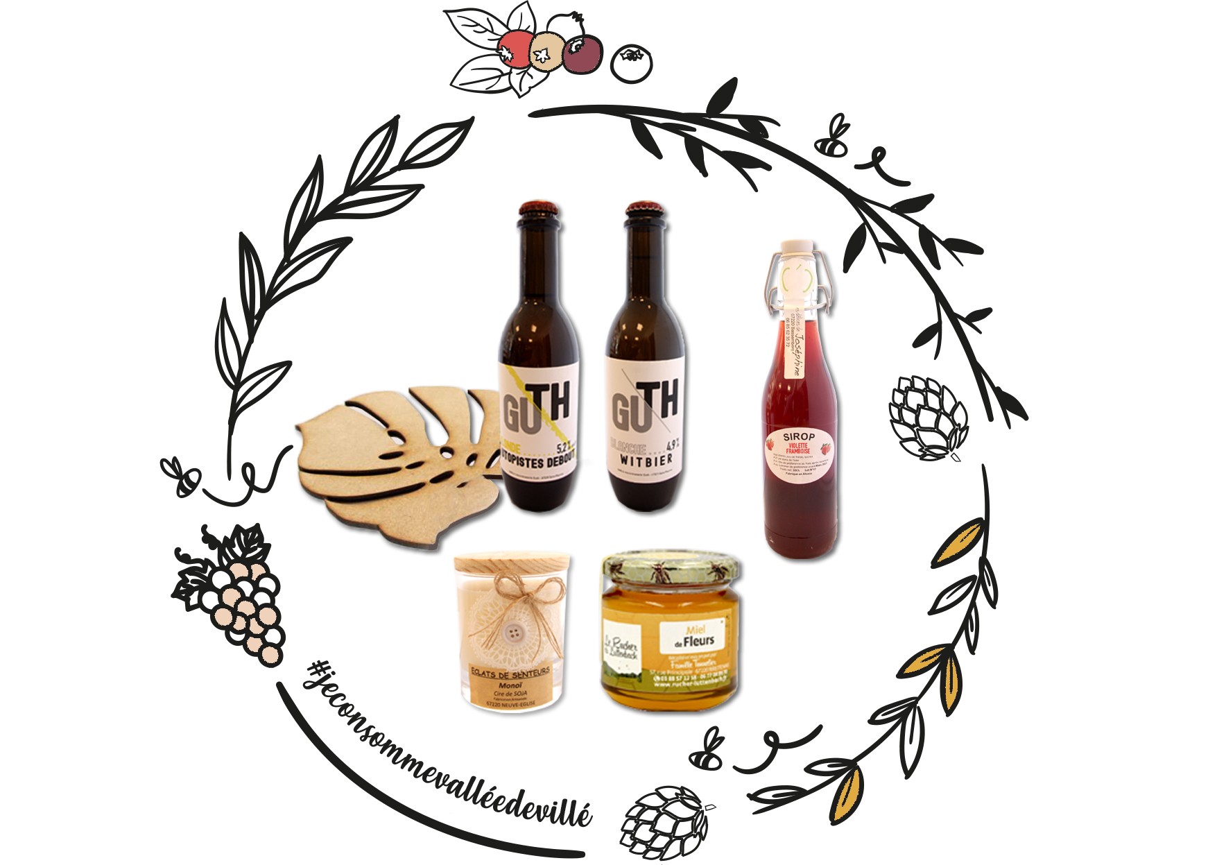 La box du mois d’août proposait en l’occurrence 6 produits dont 2 bières artisanales de la microbrasserie Güth, une bougie senteur monoï d’Eclats de senteurs, un pot de miel de 750g de fleur du Rucher du Luttenbach, un sirop de violette-framboise concocté par les Délices de Joséphine ainsi qu’un dessous de plat unique créé spécialement pour l’occasion au Fab Lab l’Inspirateur.