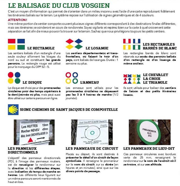 Le balisage du Club Vosgien est conçu pour être rassurant et fonctionnel : il offre en effet tant aux marcheurs occasionnels qu’aux touristes de passage ou aux randonneurs aguerris la possibilité d’emprunter les sentiers sans craindre de se perdre.